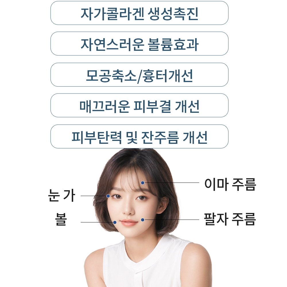 고분자 (PLA)와 히알루론산(HA)을 결합한 자가 조직 재생 콜라겐 부스터로 콜라겐 생성을 촉진하여 자연스러운 볼륨 / 탄력 / 잔주름 / 피부결 등에 개선 효과를 기대할 수 있는 시술입니다.